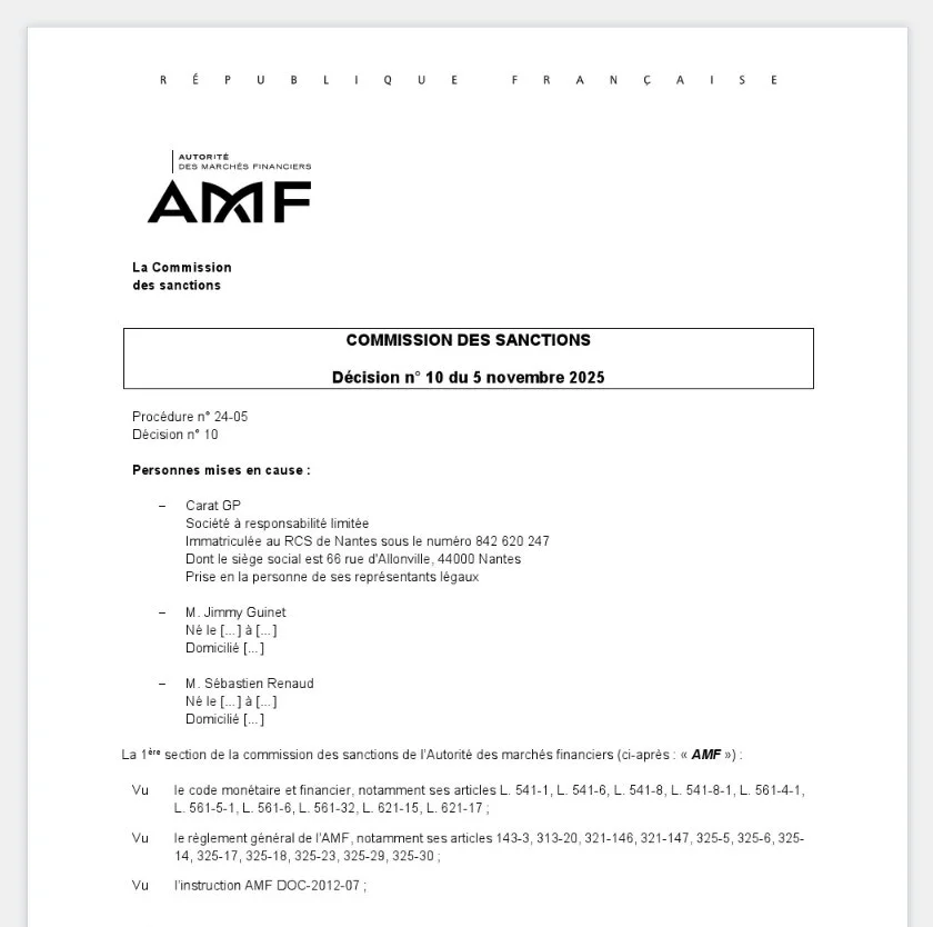 Nouvelle sanction dans le paysage des assujettis français à la LCB-FT : elle concerne la société de Conseil en Investissements Financiers (CIF) Carat GP et ses deux dirigeants, et elle est prononcée par la Commission des Sanctions de l’Autorité des Marchés Financiers (AMF).