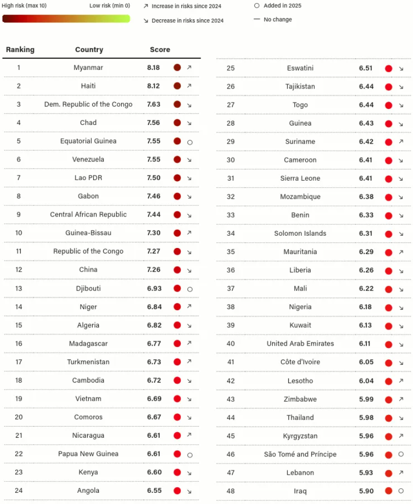 Les pays les plus exposés demeurent dans l’ensemble les mêmes que ceux déjà identifiés dans les éditions récentes, même si des variations de scores signalent quelques évolutions contrastées.