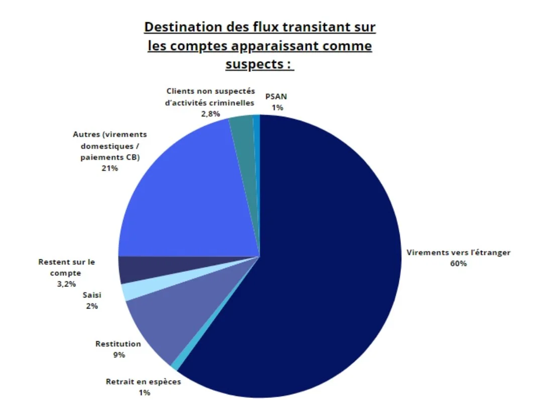 Un compte rebond, ou compte de passage, est un compte bancaire ou de paiement utilisé pour recevoir des fonds escroqués, avant de les transférer rapidement vers d’autres comptes, souvent à l’étranger. Cette mécanique complique la traçabilité des flux et favorise le blanchiment. Dans son rapport, l’ACPR s’intéresse à l’utilisation de comptes rebonds situés en France : près de 70% de ces comptes ont été créés moins d’un an avant leur utilisation à des fins d’escroquerie. 60% des flux sortants de ces comptes étaient à destination d’autres comptes situés à l’étranger, essentiellement en Europe: notamment au Luxembourg, en Lituanie et en Allemagne. Moins d’un tiers des flux suspects ont pu être bloqués et restitués aux victimes, dans le cadre de procédures de rappel des fonds.